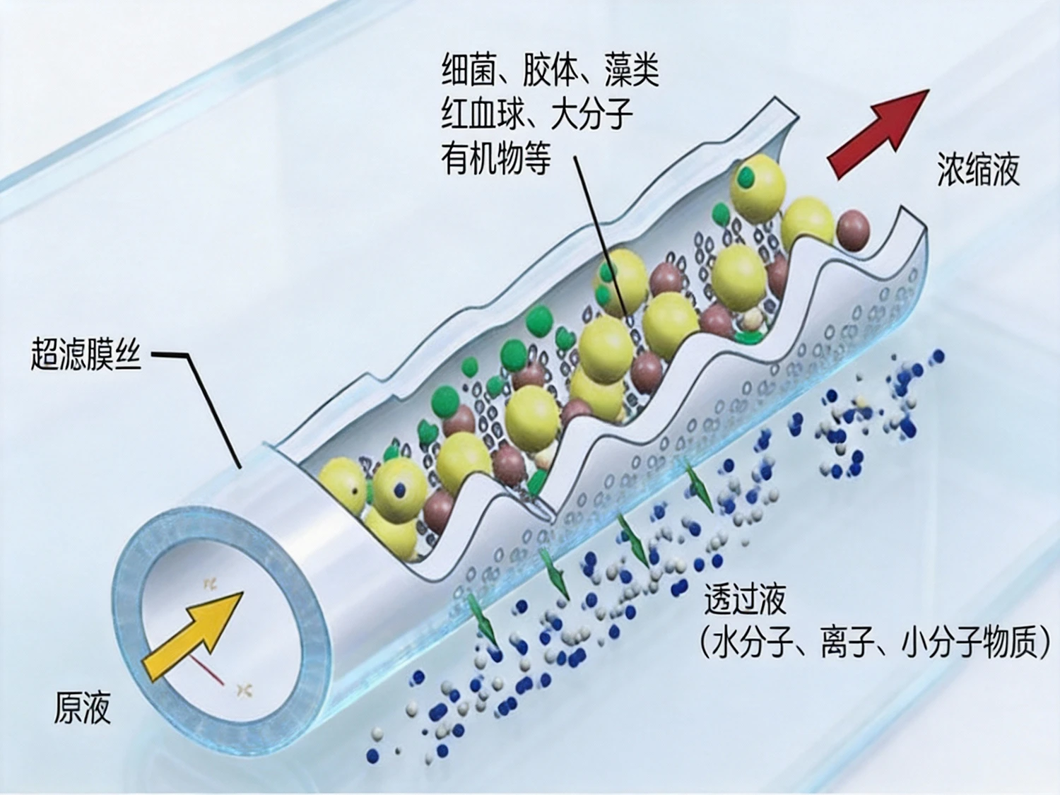 超滤是一种膜分离技术,其膜为多孔性不对称结构。过滤过程是以膜两侧压差为驱动力,以机械筛分原理为基础的一种溶液分离过程,依靠超滤膜上微小的孔道(孔径通常在0 01-0 1微米),允许水、无机盐和小分子物质通过,而将大于孔径的杂质截留。分离微细颗粒,去除浊度,使液体澄清。去除蛋白质、多糖、油脂等,能有效截留细菌、病毒(尤其是较大病毒)和病原体。