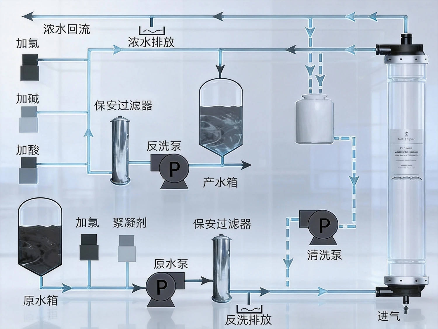 产水路径:透过滤膜 → 膜丝中心管或产水腔 → 产水管道 → 产水箱。